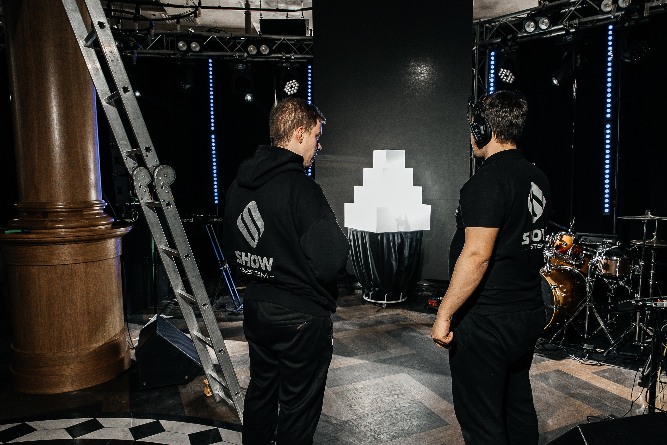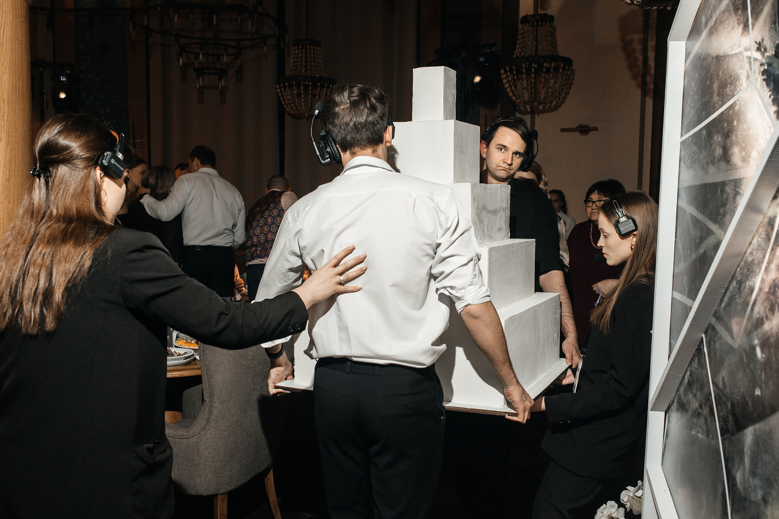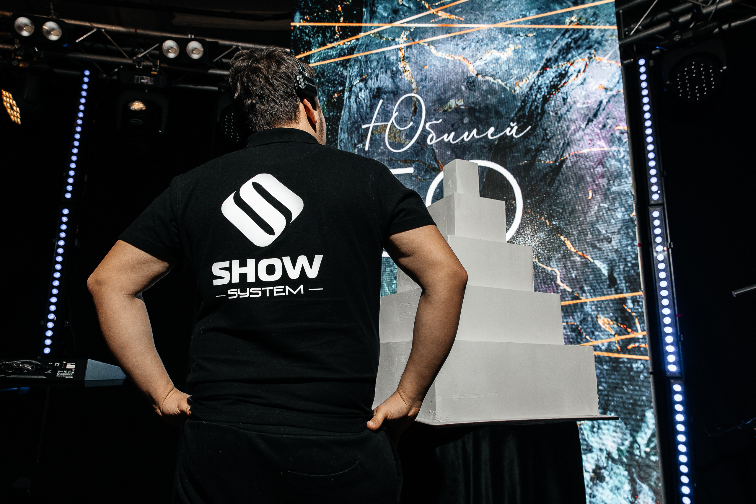 Мы предложили юбиляру интересную идею завершения вечера — показать шоу с проекцией на большом 5-ярусном торте.